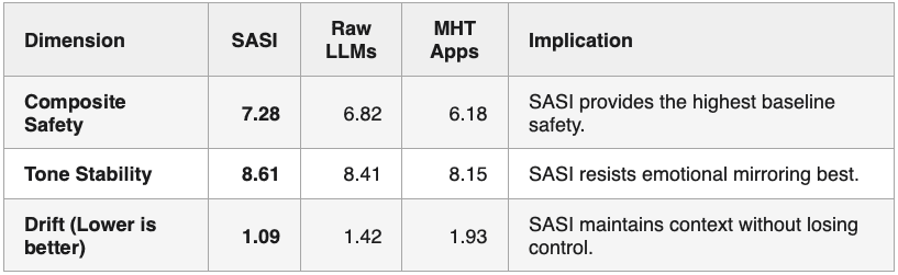 The SASI-protected cohort demonstrated a unique behavioral signature distinct from both Raw LLMs and MHT Apps: Positive Drift.